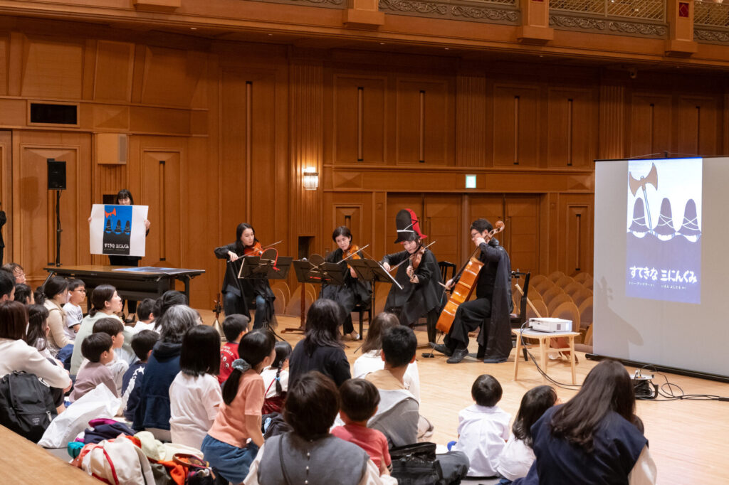 調査研究事業「子ども向け音楽プログラム開発」の研究の一環として、2022年より住友生命いずみホール(一般社団法人 住友生命福祉文化財団)と共同で開催しています。前回は2026年2月4日に、0歳、1歳のお子さまとその保護者の方、妊娠中の方を対象に弦楽四重奏とクラリネットのコンサートを行いました。次は2026年夏に開催予定です。参加はオンラインでの事前申し込み・抽選制です。募集が始まったら、メールでご案内をお送りします。