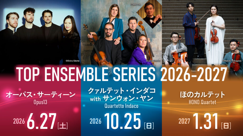 日本室内楽振興財団とザ・フェニックスホールが共催で開催する「トップアンサンブル シリーズ」。大阪国際室内楽コンクール入賞団体などの、大阪に結び付きのある卓越のアンサンブルが集まります。世界の室内楽の最前線を体感してください。